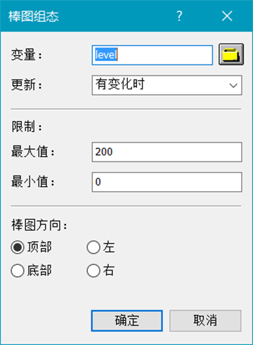 然后在弹出的组态对话框中,为棒图选择变量、数值范围以及棒图方向,如下图所示: