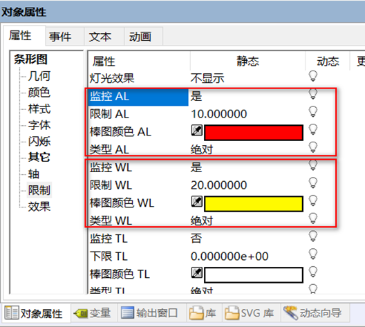 除了可以为棒图设置数值显示范围之外,可以设置最多10个监视值范围(5个高限+5个低限),每个范围以不同颜色显示。 其中,5个低限用XL表示,本例中启用“AL”和“WL”,并分别设置“AL”和“WL”的限制值和颜色,如下图所示: