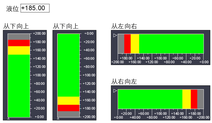 WinCC棒图可以设置为4个方向,分别为“向上”、“向下”、“左”和“右”,显示效果如下图所示: