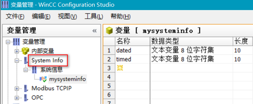 在WinCC变量管理下添加"System Info "驱动,然后在新添加的"System Info "驱动下创建新连接,并在连接下创建两个变量分布用来读取系统日期和时间,如下图所示: