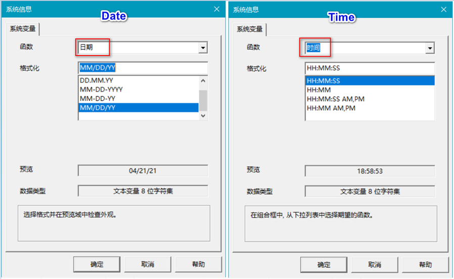日期和时间变量的数据类型都是“文本变量8位字符集”,变量地址及格式如下图所示:
