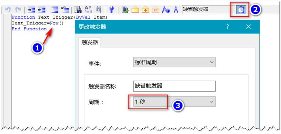 VBS脚本为:Text_Trigger=Now(),其中Text_Trigger为函数名称,Now()获取当前系统日期时间(①②③)。设置脚本触发器(②),选择周期为1秒(③),如下图所示: