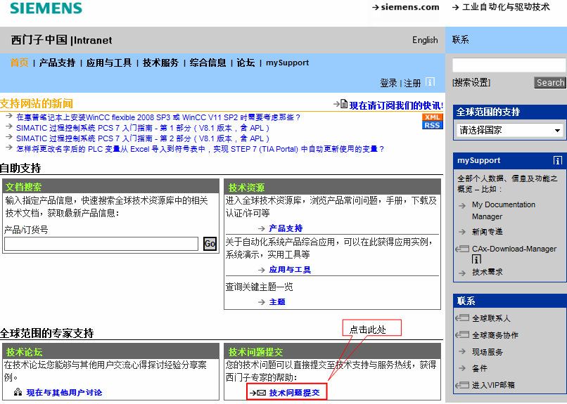 1、通过西门子技术支持网站申请,打开如下网址,点击“技术问题提交”: