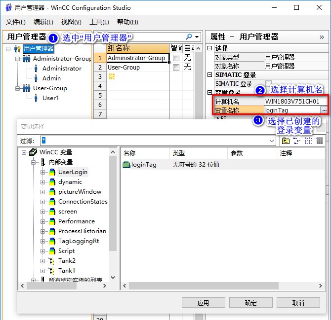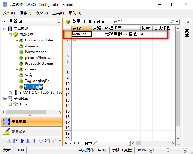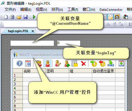 在画面中添加输入/输出域关联内部变量“@CurrentUserName”以及“loginTag”,并添加“WinCC 用户管理”控件。