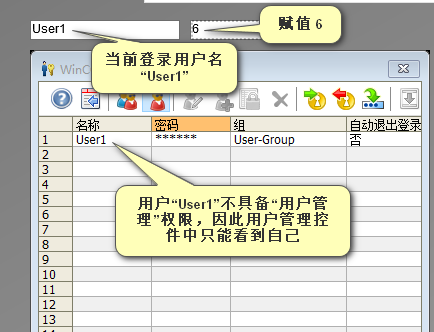 只有登录了具有“用户管理”权限的用户,才能在用户管理控件中看到所有用户,并且能在运行系统中重新分配登录变量的变量值。在输入/输出域中赋值 1 ,则用户“Administrator”实现登录 。