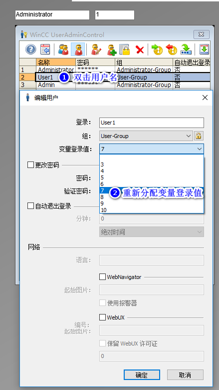 在用户管理控件中双击用户名,在弹出的“编辑用户”对话框中即可重新分配变量登录值,例如将“User1”的变量登录值重新分配为 7 。