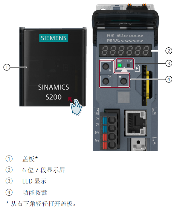 SINAMICS SDI (Smart Drive Interface) Status 面板位于驱动器的正面,用户可以使用SDI Status 面板进行以下操作: