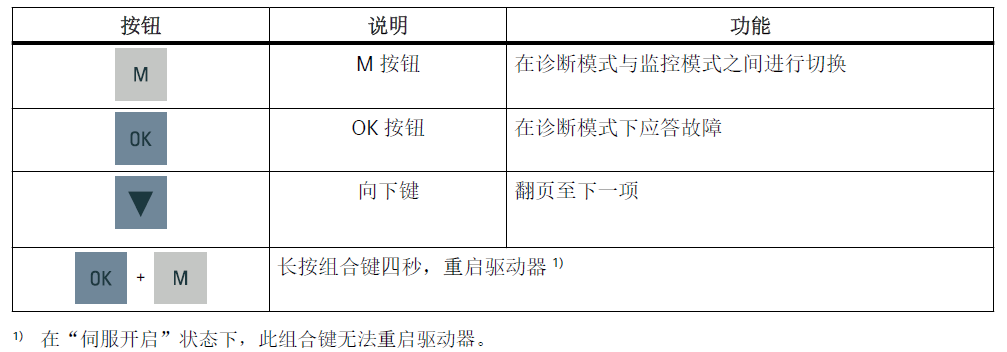 - 诊断:当出现新的故障、报警或安全消息时,面板显示报警/故障/安全消息代码。在消除故障原因后,可以使用OK按键来应答故障。用户可按下 M 按钮来切换监控模式和诊断模式。