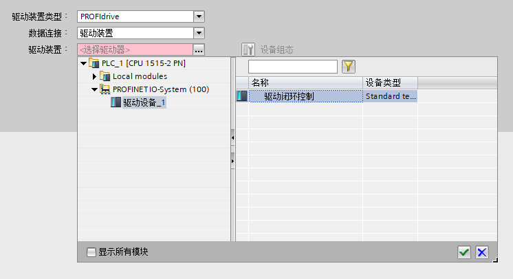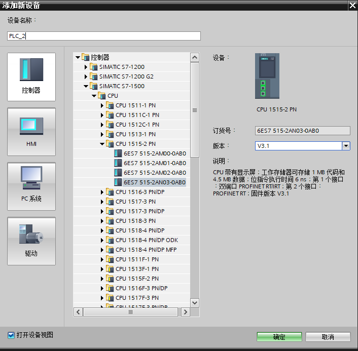 注意:此处添加的S7-1500 PLC与S200 PN伺服驱动的订货号、固件版本,必须与实际使用的相一致。
