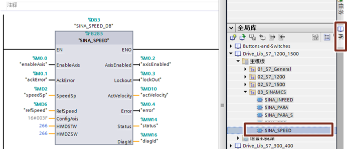 ② 下载安装DriveLib库文件,从库文件中调用SINA_SPEED功能块。
