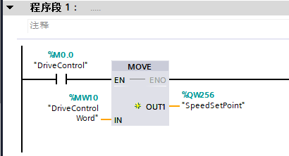 2、在OB1中调用MOVE命令,发送对驱动的控制字及速度给定: