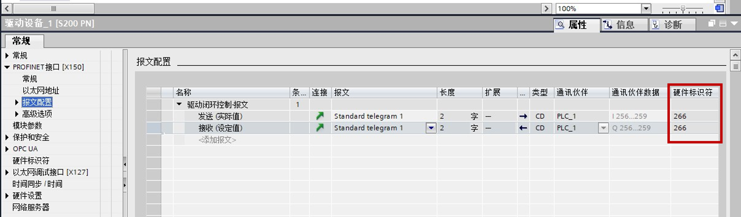在博途软件的设备视图中,选中s200,依次选择“属性” >> “常规” >> “PROFINET接口” >> “报文配置”。