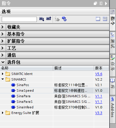 ① 在博途软件右侧的“指令“栏中,依次选择“选件包” >> ”SINAMICS” 文件夹 >> SINA_SPEED 功能块。
