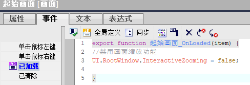 场景1:如果项目组态时没有使用“画面窗口”控件而是创建了多张画面,要想禁用画面缩放的话,需要借助JavaScript (简称:JS) 脚本实现。仅需要在项目的“起始画面”已加载事件中编写JS脚本即可,其他画面的“已加载”事件并不需要编写JS脚本。