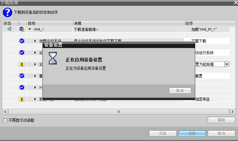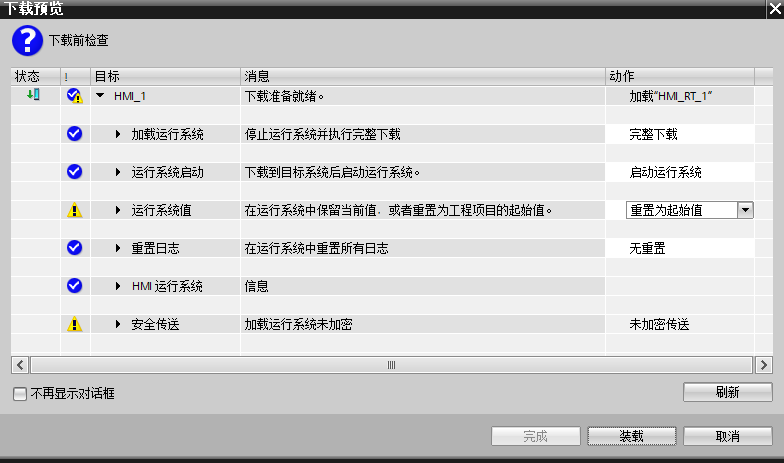 在弹出的“下载预览”窗口中根据需要选择对应的动作后点击“装载”按钮即可实现HMI项目的下载。