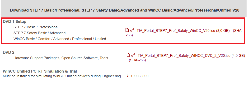 打开此链接找到WinCC Unified PC Runtime V20(V20.00.00.00)条目并下载。