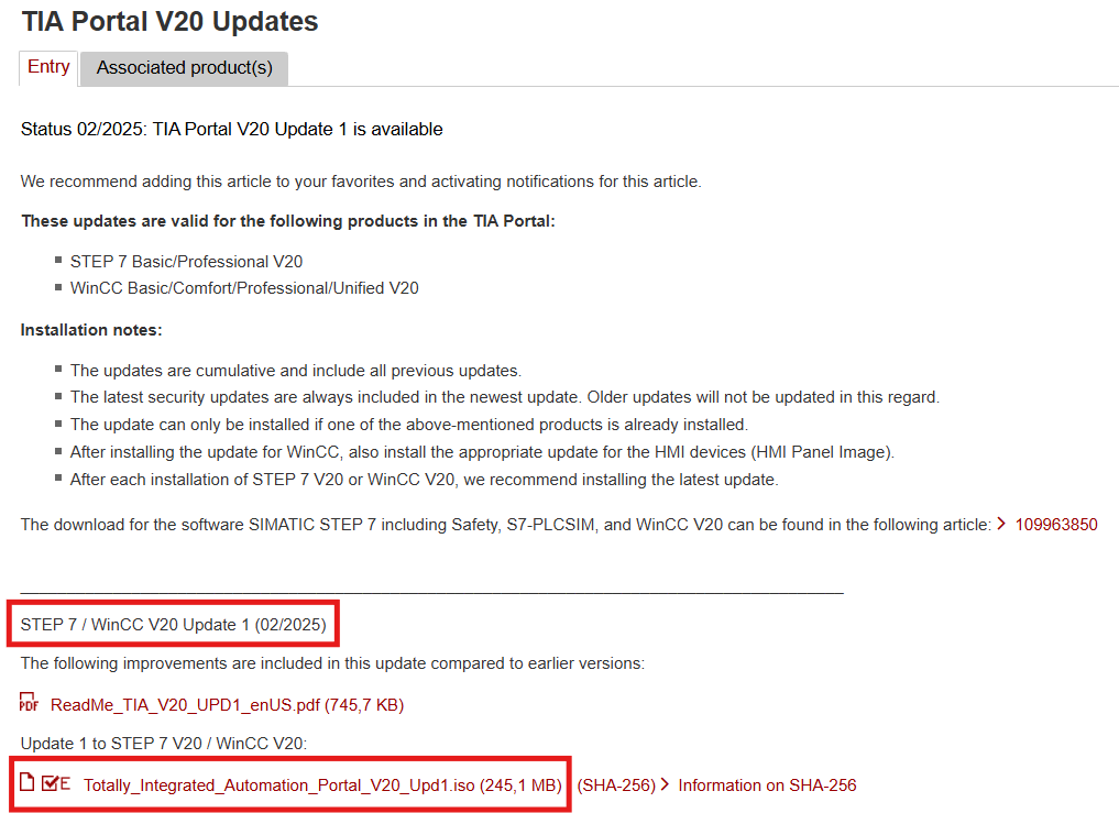 打开此链接找到最新的更新包条目并下载,本例中最新的条目是V20 Upd.1,根据提示TIA Portal V20 Update 1的特性已经在面板映像 V20.0版本中可用,它们是兼容的。而新的面板映像计划更新V20 Update 2后提供。所以这里我们选择V20.0版本映像。如果后期有更新的面板映像,请使用更新的面板映像。