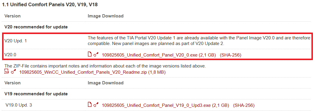打开此链接找到最新的更新包条目并下载,本例中最新的条目是V20 Upd.1,根据提示TIA Portal V20 Update 1的特性已经在面板映像 V20.0版本中可用,他们是兼容的。而新的面板映像计划更新V20 Update 2后提供。所以这里我们选择V20.0版本映像。如果后期有更新的面板映像,请使用更新的面板映像。
