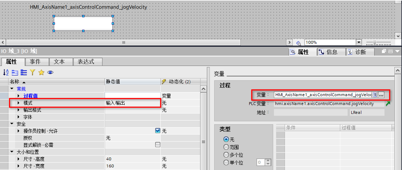 结合第二节的例子,如果内部变量 axisControlCommand_jogVelocity_maxLimit=300,那么变量 hmi_axisName1_axisControlCommand_jogVelocity 的限值范围为 0.5-300。如果IO域关联变量 hmi_axisName1_axisControlCommand_jogVelocity,触摸屏运行的过程中,操作员无法从IO域输入0.5-300范围以外的数据。
