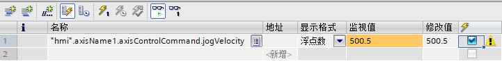 例如用PLC监视表赋值500.5,超出 hmi_axisName1_axisControlCommand_jogVelocity 的值范围0.5-300,触摸屏画面的 IO 域会显示黄色叹号。