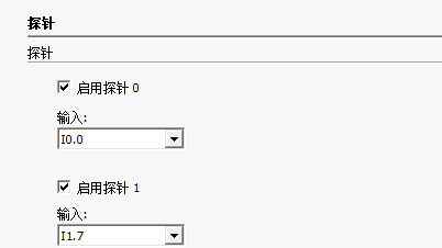 编码器轴支持探针功能。可通过选择“启用探针 0”(Enable probe 0) 和“启用探针 1”(Enable probe 1) 来启用探针控制。可分配 CPU 上从 I0.0 到 I1.7 之间的任何一个输入。