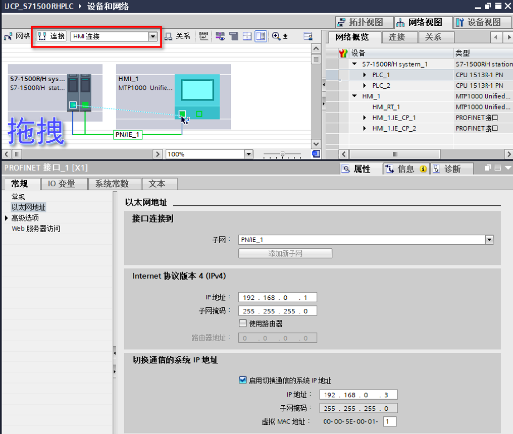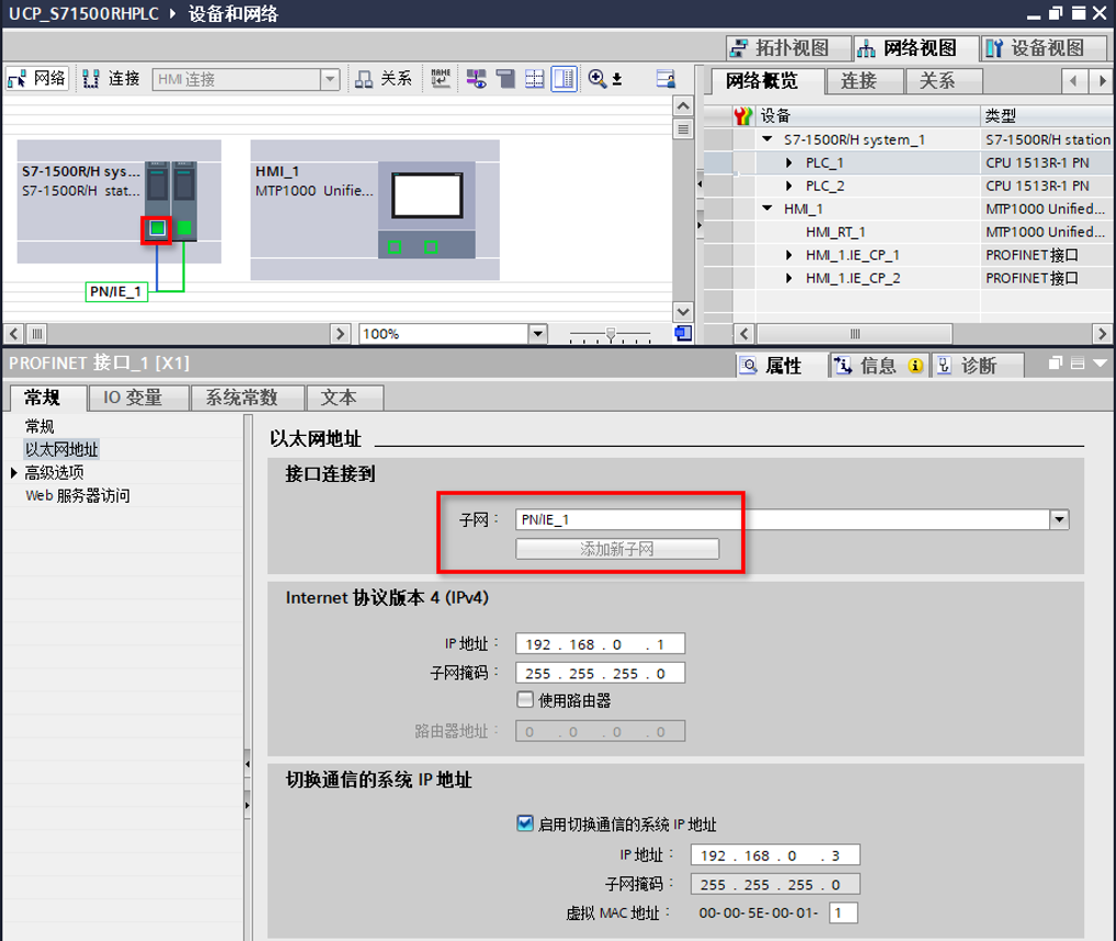 步骤1:S7-1500R/H PLC是博途平台的冗余系列的 PLC,需要设置 PLC 的系统 IP(HMI需要跟该系统IP建立通信关系)。在“设备和网络”中,选中 PLC 设备的网口,在属性中进行设置。