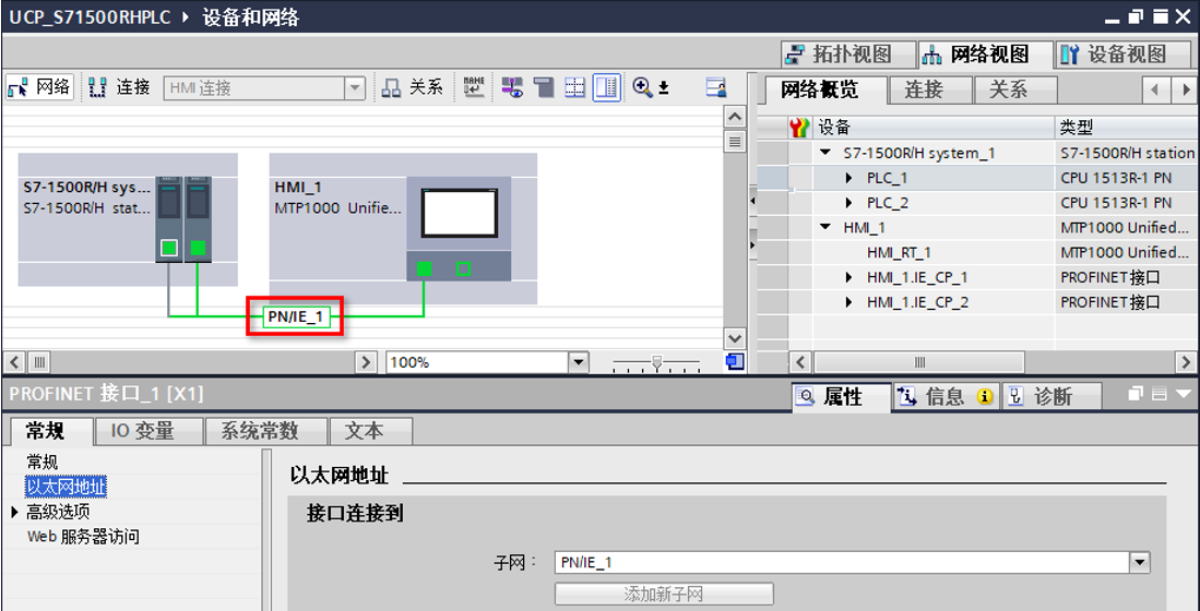 ● 方法1: TIA Portal 添加的 S7-1500R/H PLC 设备的时候,会自动添加一个子网:“PN/IE_1”, 在“设备和网络”中点击左上角的“网络”,在 PLC 设备网口的属性中,可以查看该子网。