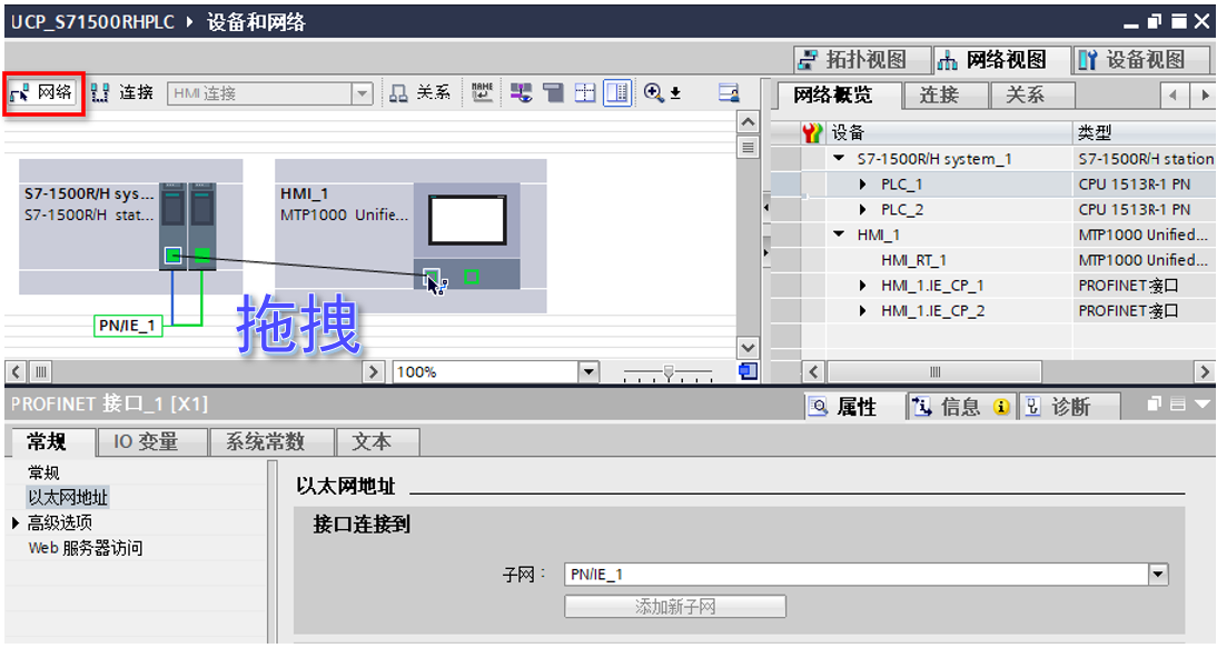 ● 方法2:在“设备和网络”中点击左上角的“网络”,按住鼠标左键从 PLC 设备的网口拖拽到 HMI 侧的网口,然后松手,会显示创建了“PN/IE_1”。