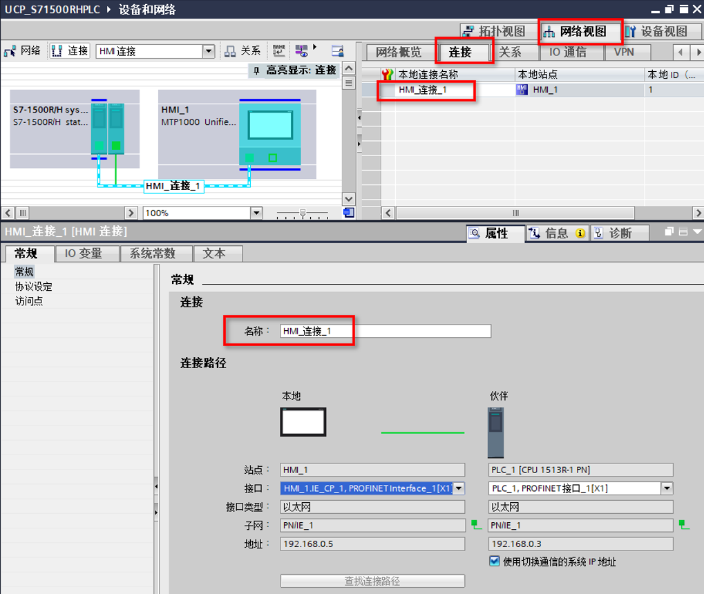 可以在网络视图中看到已经创建了 HMI 连接。在右侧的“连接”选项卡中,可以看到创建的连接,点击新创建的连接,可以在属性卡中看到连接的具体属性: