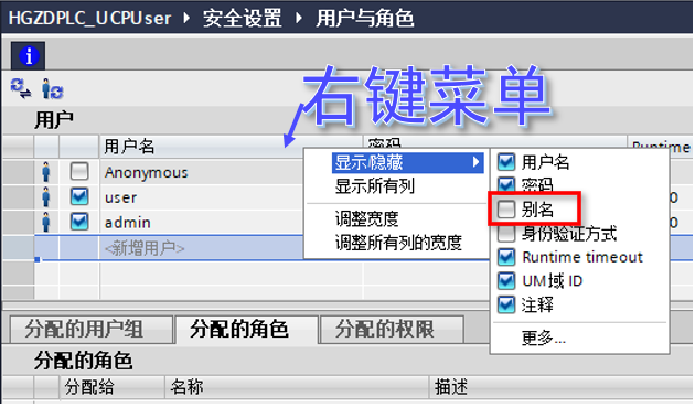 步骤3:创建2个用户,分别是 admin 和 user 用户,然后将 admin 的用户角色分配为“HMI 管理员”,user 的用户角色分配为“HMI 操作员”。角色的作用是用来对权限进行分组。