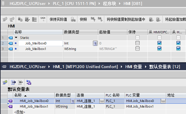 步骤4:添加 PLC 与 HMI 变量,作为 PLC 给 HMI 发送作业号的载体。这里用两个变量来举例,Int 类型变量“HMI_Job_Mailbox0”用来传递登录和注销指作业代码,WString 类型变量“HMI_Job_Mailbox1”用来传递用户的别名。
