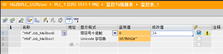 如图,"HMI".Job_Mailbox0 赋值数值 24,HMI 会注销登录的用户。工程师可以根据实际情况在 PLC 中编写逻辑控制 HMI 用户的注销与登录。