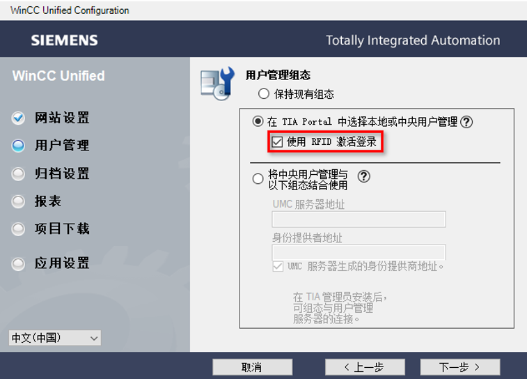 Unified 精智面板仿真或者 WinCC Unified PC 项目运行时使用该功能,需要在 WinCC Unified Configuration Manager 的设置中启用“激活使用RFID登录”(Activate login with RFID)选项。