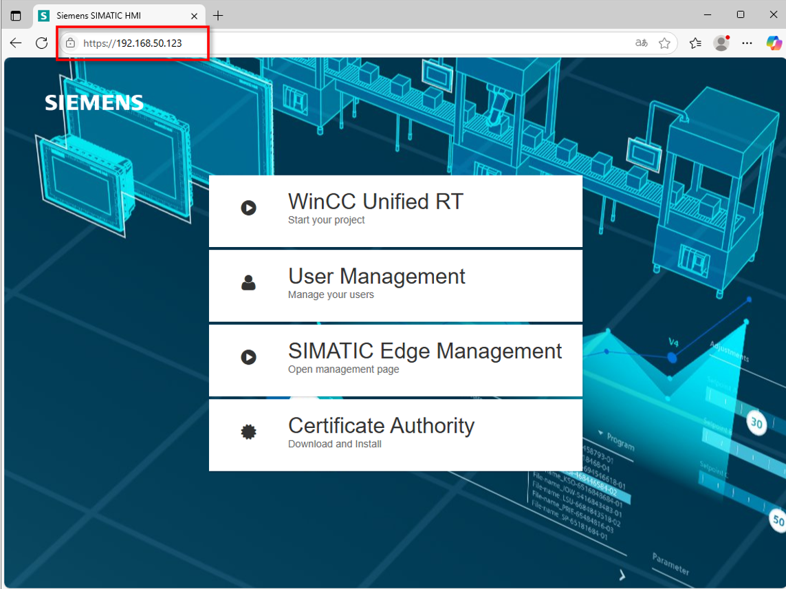 (2)Unified 面板运行项目后,网络中的访问设备的浏览器中输入触摸屏的IP地址。如下图,如果访问设备中没有安装证书,浏览器地址栏会显示“不安全”的标识。点击高级按钮,浏览器可以在非安全通信的情况下访问 Unified 面板。