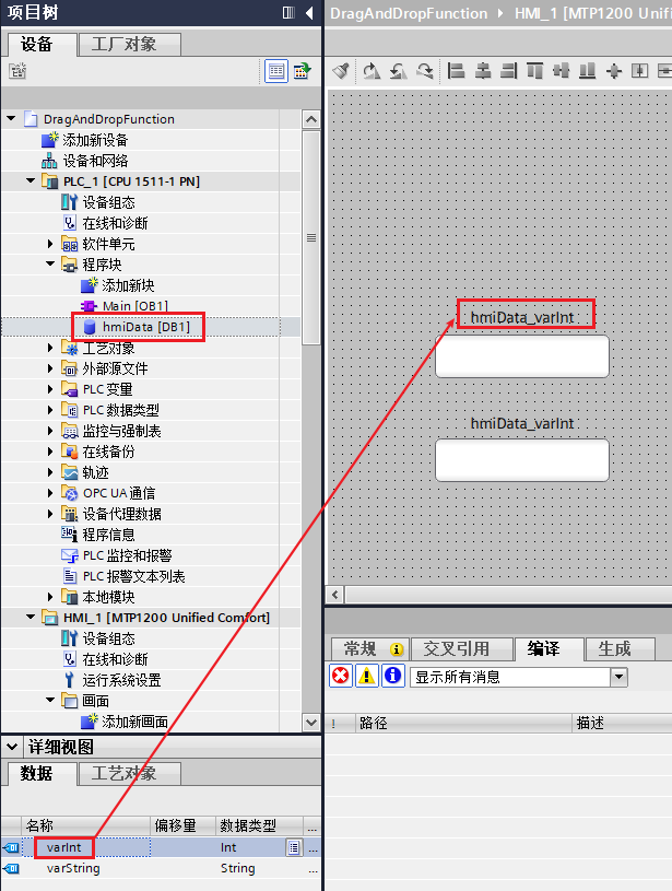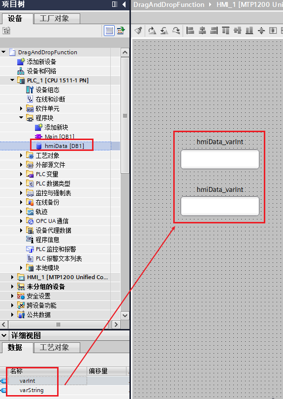 例如项目中的 S7-1500 PLC在数据块中定义了需要和 HMI 交互的变量,HMI 侧需要对变量执行读写操作,按照常规的组态步骤,需要在HMI画面中添加“IO域”元素,然后在 IO 域的过程值动态化属性中关联变量。如果画面中有多个 IO 域,按照上述步骤完成组态的话相当耗时。使用“详细视图”功能可以快速生成IO域并完成变量的自动关联。仅需要在展开的“详细视图”界面点击 PLC 的数据块,然后根据需要选择对应的变量拖拽到HMI画面即可快速生成IO域并自动完成变量的关联。拖拽完成后软件也会自动在 HMI 的默认变量表中生成对应的变量。