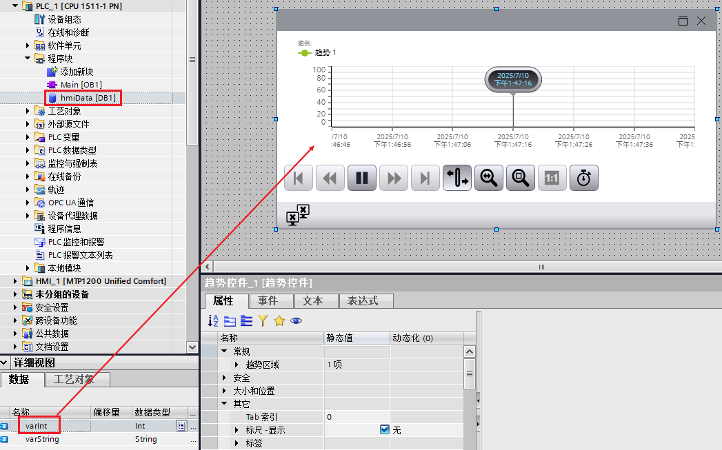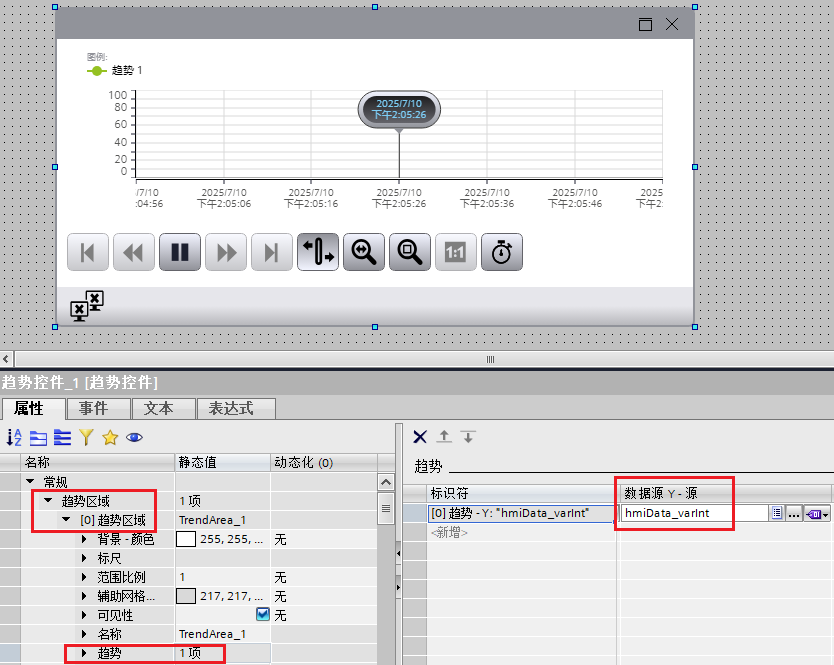 “趋势控件”主要是以趋势图的形式显示实时数据或者历史数据。“趋势控件”可供配置的对象属性较多,如何快速关联变量呢?仅需要在画面上添加完“趋势控件”后通过“详细视图”选择变量拖拽到控件上即可完成变量的关联。
