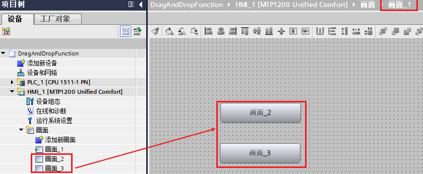画面组态时通常会添加多张画面,如何快速生成切换画面的按钮呢?仅需要选择画面名称到画面即可生成切换画面的按钮。需注意:不支持拖拽当前画面名称到画面自身。