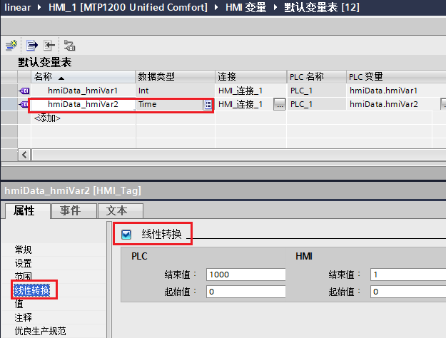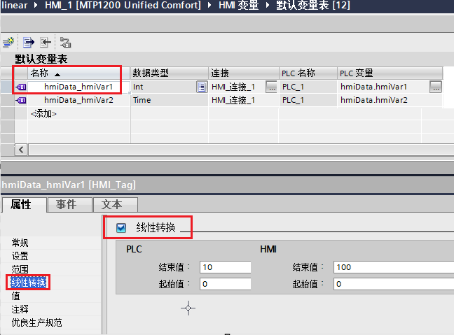 在HMI变量表定义变量后可以在其属性中设置线性转换。如下图所示。