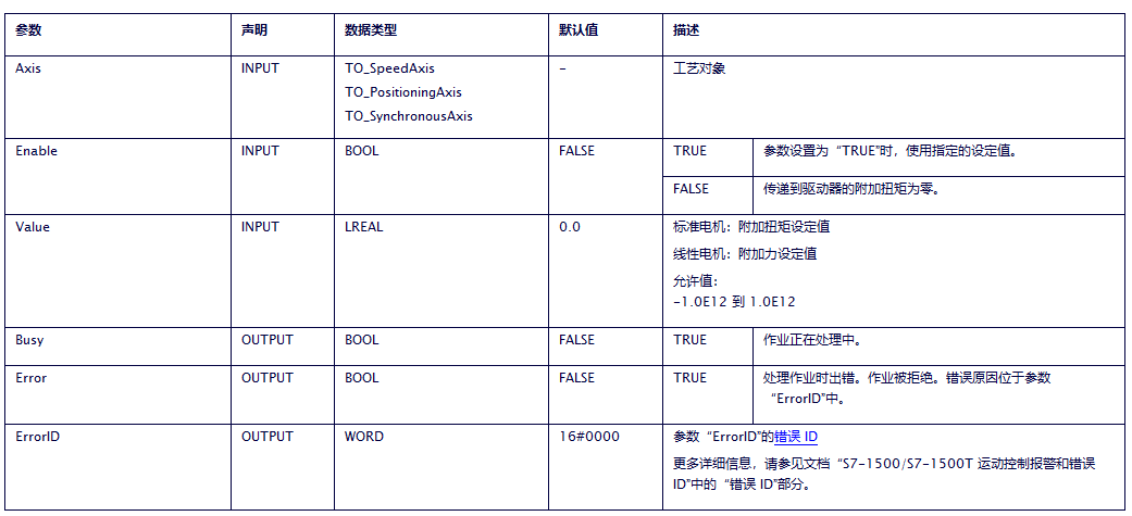 通过"Enable = TRUE"激活该功能块的驱动附加转矩给定功能,在参数"Value" 中指定附加扭矩设定值,可实时修改附加转矩给定值;通过"Enable = False"去除驱动的附加转矩给定功能。