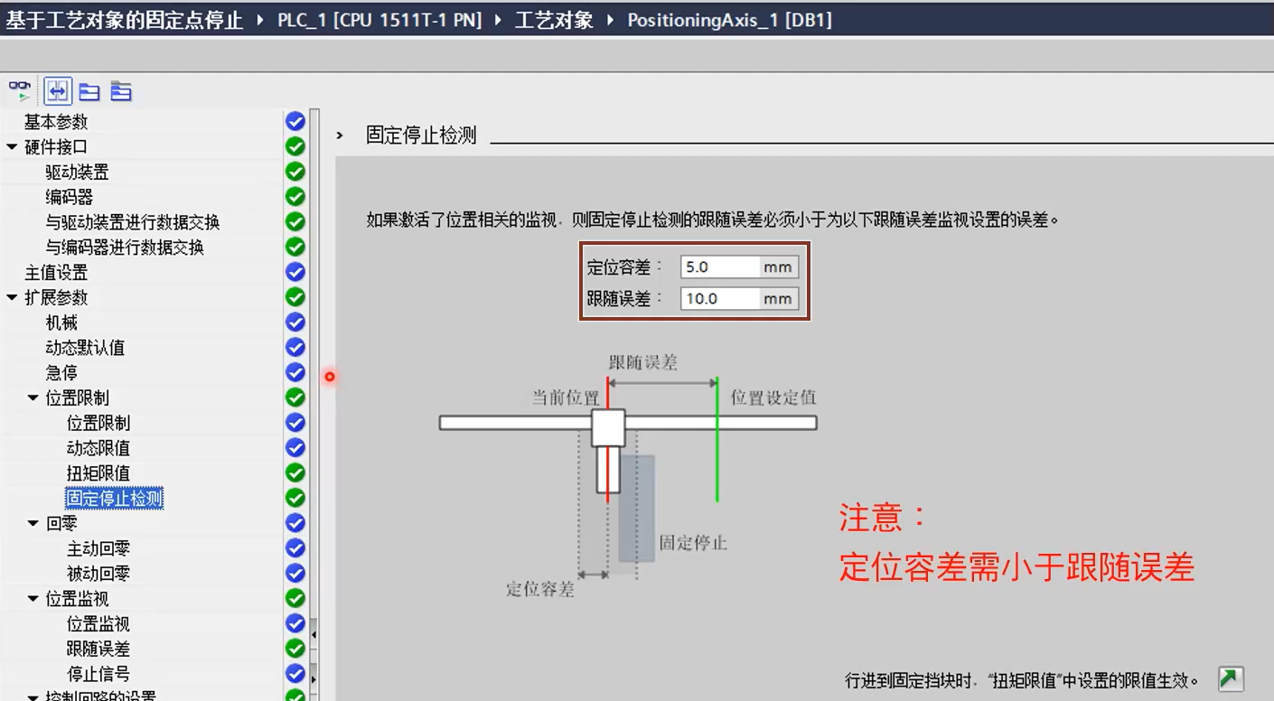 4、配置工艺对象“固定停止点”功能的参数设置,设置“定位容差”和“跟随误差”。其中,跟随误差用于判断工艺夹紧和拧紧的位置到达,定位容差用于限制到达固定停止点后的位置偏移。注意:定位容差需要小于跟随误差。