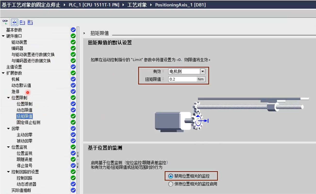 2、在工艺对象组态中,“扩展参数”>> “位置限制” >> “扭矩限制” 中,将“有效”设置为“电机侧”,并且“禁用位置相关的监控“。