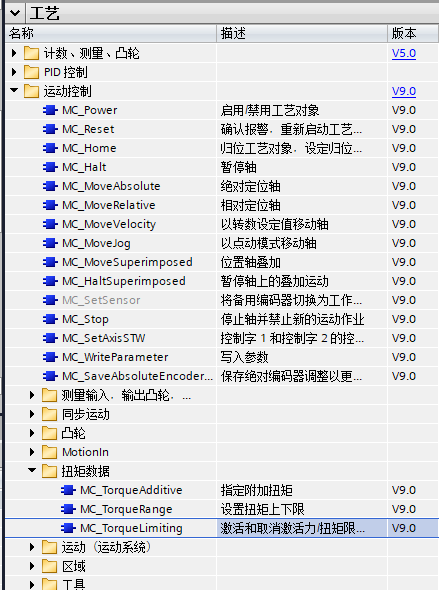 5、在程序中调用“MC_TorqueLimiting” 功能块,路径“工艺”>> “运动控制”>> “扭矩数据”;