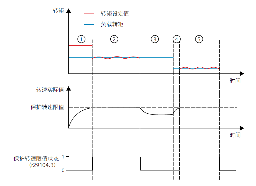 ④ 当负载转矩显著低于转矩设定值时,转速实际值不断提高,直到保护转速限值。