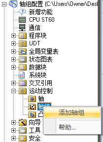 1. 配置好单轴之后,在软件左侧项目树中,单击“运动控制”,选择“轴组”右键选择“添加轴组”。