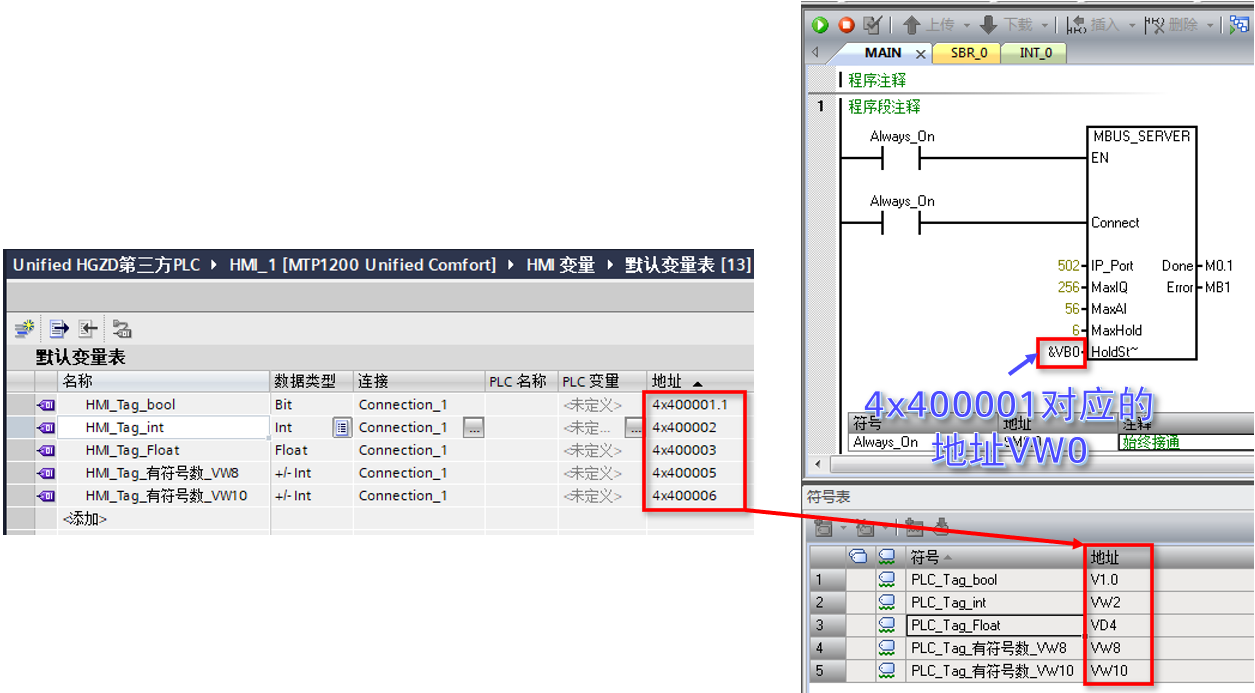 步骤4:Unified 面板项目中,添加要与 Modbus 控制器通信的 HMI 变量。Modbus 地址与 S7-200 SMART 地址对应关系,如下图。