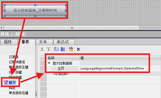 组态一个按钮元素,在按钮元素的按下事件中,添加函数:显示控制面板,主页参数处输入 LanguageRegionAndFormats.DateAndTime 。