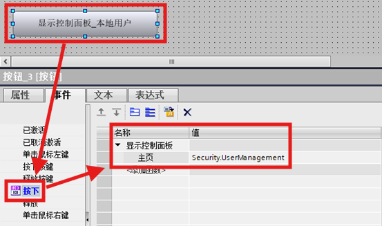 组态一个按钮元素,在按钮元素的按下事件中,添加函数:显示控制面板,主页参数处输入 Security.UserManagement。