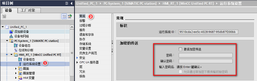 - “运行系统设置”中禁用加密传送 且在“WinCC Unified Configuration”中取消勾选“激活安全下载”