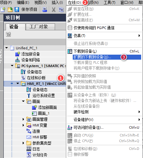 在项目树左侧选中WinCC Unified PC RT 项目,点击菜单中“在线”,然后点击“扩展的下载到设备”。