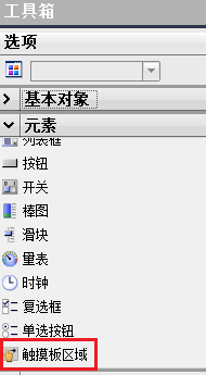 可以在“工具箱”下的“元素”中看到“触摸板区域”,直接将其拖拽到画面进行组态。